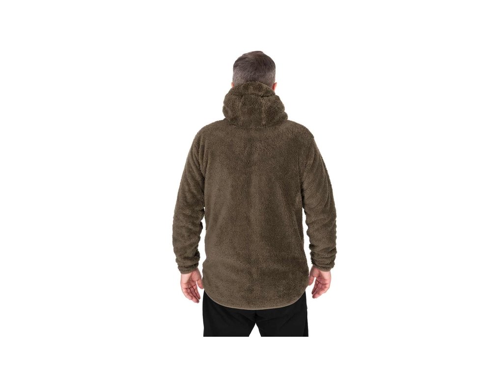 Teplá bunda z plného plyšového Teddy fleeecu (100% polyester, 270g/m²), celoprepínací zips, priliehavá kapucňa, dve bočné vrecká na ruky a jedno náprsné na zips, príjemný dizajn v khaki odtieni, dostupná vo veľkostiach M-XL