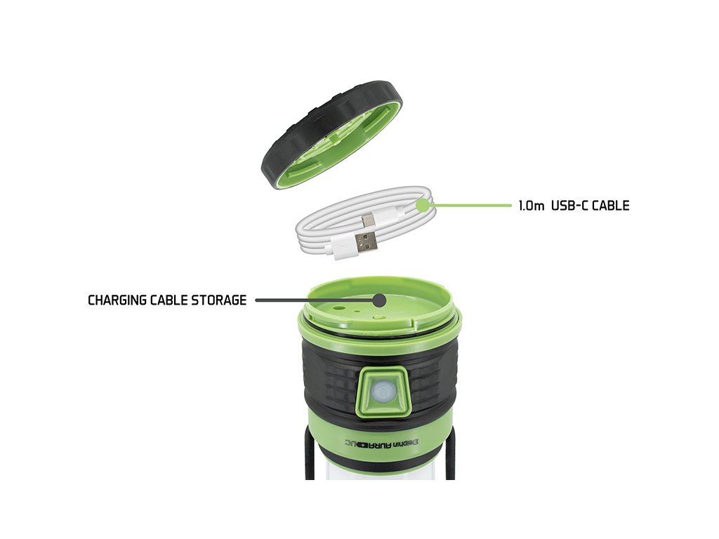 AURA+ ponúka 3 režimy svietenia bieleho svetla, svietenie zeleným svetlom (dlhšie podržanie tlačidla) a funkciu svetelného SOS (zeleným svetlom). Lampáš je možné položiť na pevný povrch, vďaka pogumovanej podstave je veľmi stabilný. Okrem toho má vo vrchnej a spodnej časti karabíny, a tak si ho môžete zavesiť v stane či bivaku. Má masívnu rukoväť, prenášanie je veľmi pohodlné a praktické. AURA+ má dokonca funkciu "powerbanky", a tak si pomocou neho môžete dobiť napr. mobilný telefón. Lampáš sa nabíja pomocou priloženého USB-C kábla. Ten je možné vložiť do vodeodolného priestoru v spodnej časti lampáša, nehrozí tak jeho strata. Rovnakým káblom potom môžete dobíjať zariadenia s koncovkou USB-C. Tlačidlo zapínania slúži aj ako indikačná dióda, vďaka ktorej zistíte stav nabitia akumulátora.
