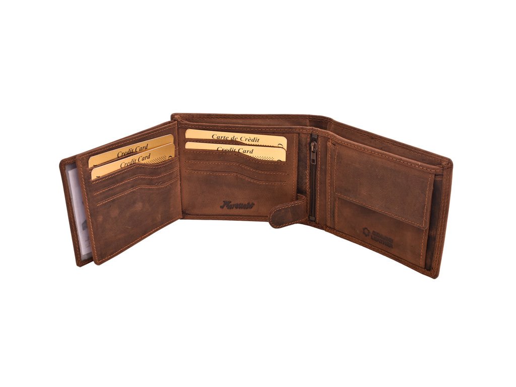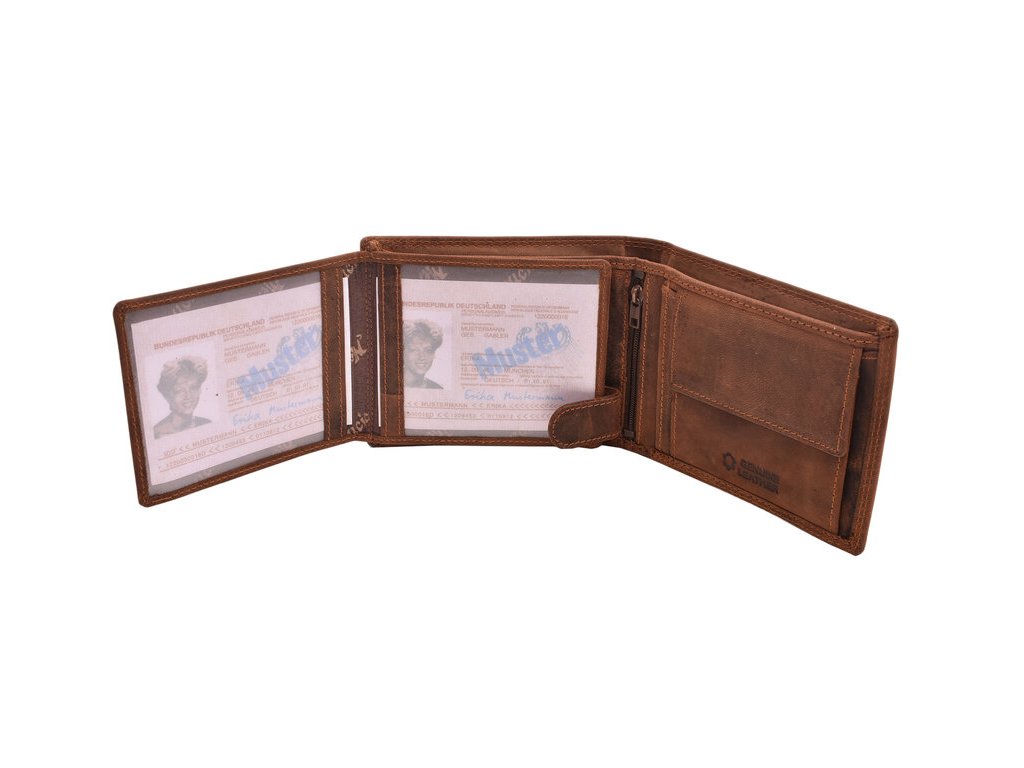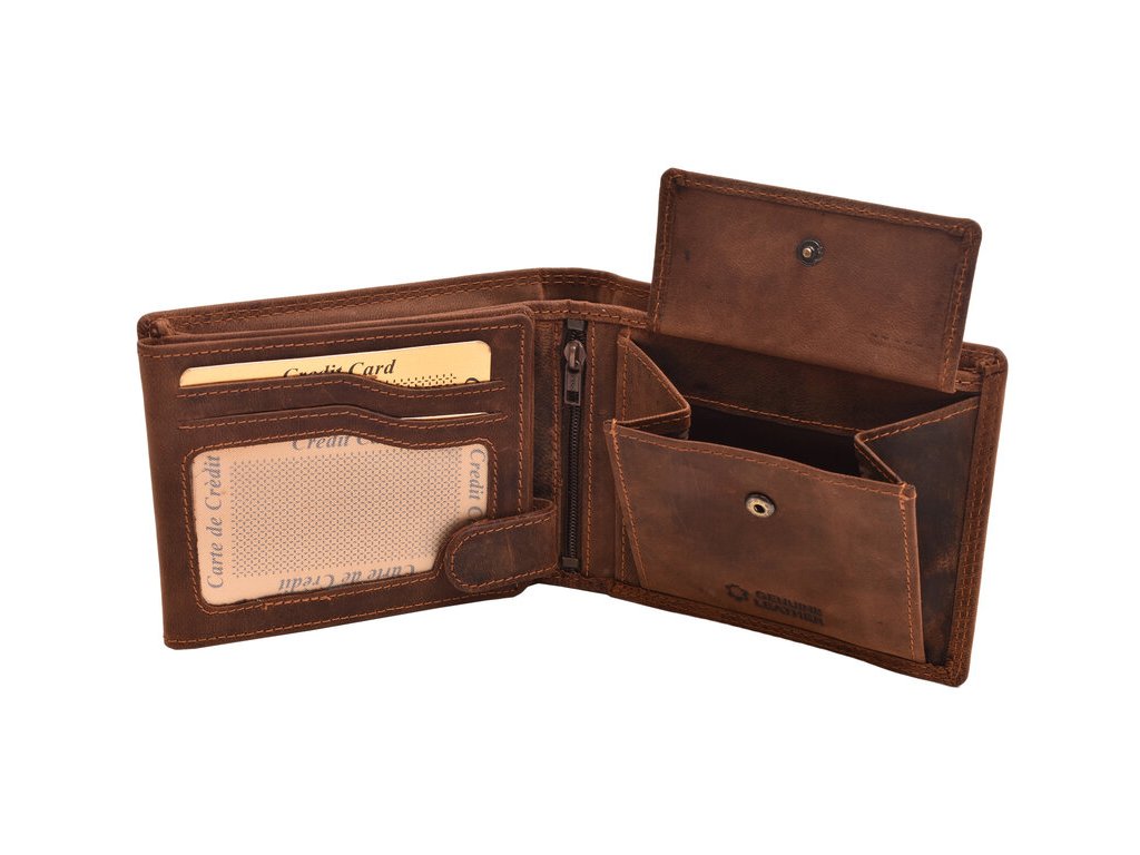 Kožená pánska peňaženka s praktickým vnútorným členením a motívom celého medveďa na prednej strane. Vnútro ponúka množstvo priehradiek na karty, ako aj priehľadné priehradky vhodné na uloženie fotiek alebo dokladov s fotkami, vrecko na mince, ktoré sa nachádza vo vnútri, hneď vedľa zipsovej priehradky.