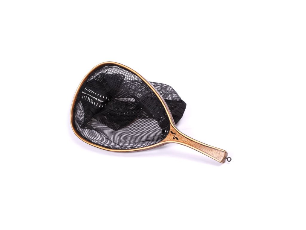 Precízne spracovaný muškársky podberák z tropického dreva. Sieť má merací pás.