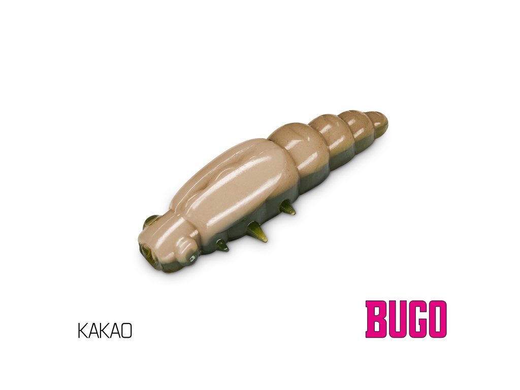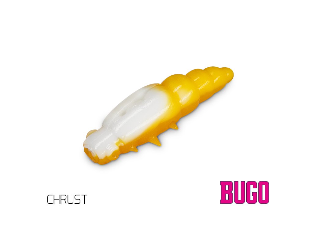 Pri vývoji nástrahy sme sa inšpirovali prirodzenou potravou dravých rýb, v tomto prípade najmä larvou osy. Naši dizajnéri si dali záležať najmä na detailoch ako sú oči alebo zárodky krídel. Vďaka novému materiálu nástraha disponuje aj dvomi veľmi efektívnymi vlastnosťami. Prvou je neuveriteľná pružnosť materiálu, čo zamedzí poškodeniu nástrahy aj po viacerých záberoch a zdolaných rybách. Druhá významná vlastnosť materiálu je nasiakavosť arómou. Vďaka tomu, najmä pri love pstruhov dochádza k opätovnému ataku nástrahy zo strany dravca. Pri akomkoľvek stlačení dochádza k uvoľňovaniu výraznej syrovej arómy, ktorá rybu zaujme a prinúti ju k opätovnému, agresívnejšiemu záberu. BUGO ponúka širokú škálu tých najúčinnejších farebných vyhotovení, ktoré boli vybraté na základe dlhodobých testov na rôznych vodných plochách. Navyše sú tieto farby UV aktívne a umožňujú intenzívnejší odraz slnečného žiarenia pod vodou, vďaka čomu sa nástrahy stávajú neprehliadnuteľnými aj vo veľkých hĺbkach, alebo počas slabých svetelných podmienok. Masívne telo v kombinácii s plávajúcim materiálom spomalí prepad nástrahy vodným stĺpcom. Nástrahu BUGO je vhodné použiť s mikro jigmy alebo tungstenovou hlavičkou nastraženou na jigovom háčiku. Vďaka realistickému vzhľadu, neodolateľnej aróme či extrémnej pružnosti táto nástraha nesmie chýbať vo výbave žiadneho nadšenca lovu pstruhov. Okrem toho je však vhodná aj na lov iných menších rýb ako napríklad ostriež a jalec. Nepohrdne však ňou ani väčší dravec ako šťuka či zubáč.