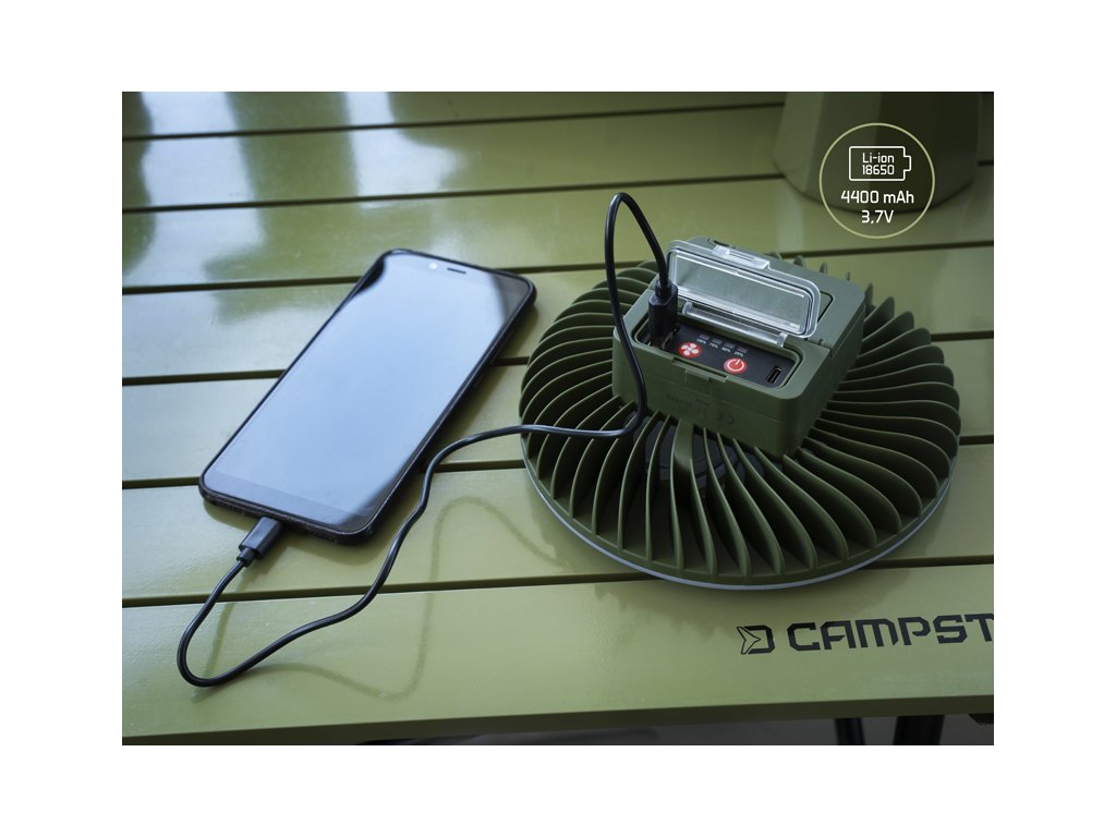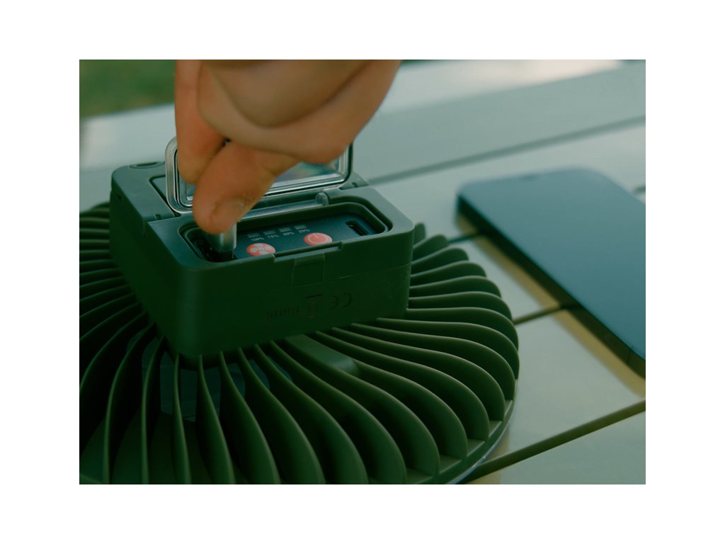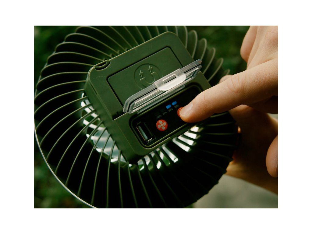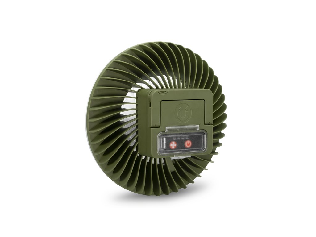 Rovnako ako osvetlenie, aj ventilátor ponúka tri režimy intenzity, vďaka čomu si ho jednoducho prispôsobíte podľa aktuálnych teplotných podmienok. Prvým stlačením sa spustí ventilátor na nízku intenzitu, pri ktorej batéria vydrží až 19 hodín. Druhé stlačenie zvýši výkon ventilátora, pričom výdrž sa skráti na približne 14 hodín. Pri najvyššej intenzite, aktivovanej tretím stlačením, ventilátor vydrží pracovať približne 11 hodín.