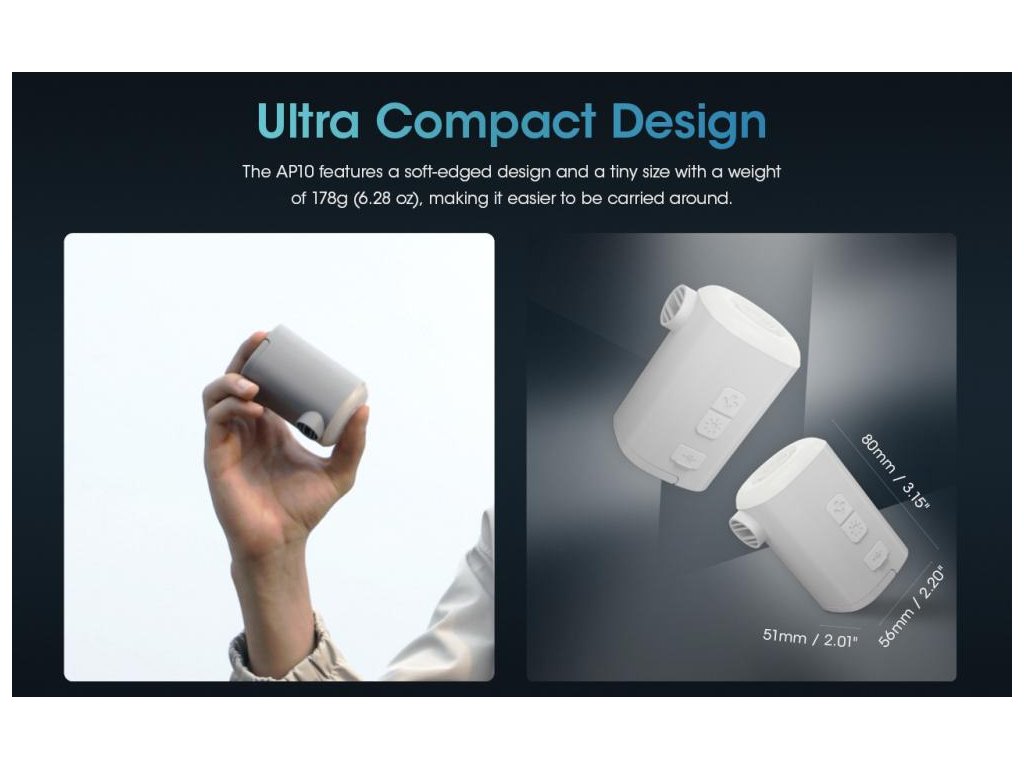 AP10 má kompaktný dizajn s oblými hranami, ktorý je schopný produkovať maximálny tlak vzduchu 4,5 kPa a maximálny prietok vzduchu 300 l/min. Disponuje tiež režimom osvetlenia s maximálnym jasom 300 lúmenov. Je vybavená 4 dýzami, ktoré sú kompatibilné s rôznymi produktami potrebnými na nafukovanie alebo vyfukovanie.